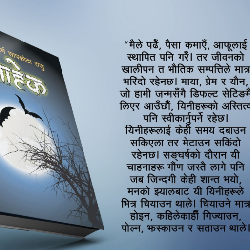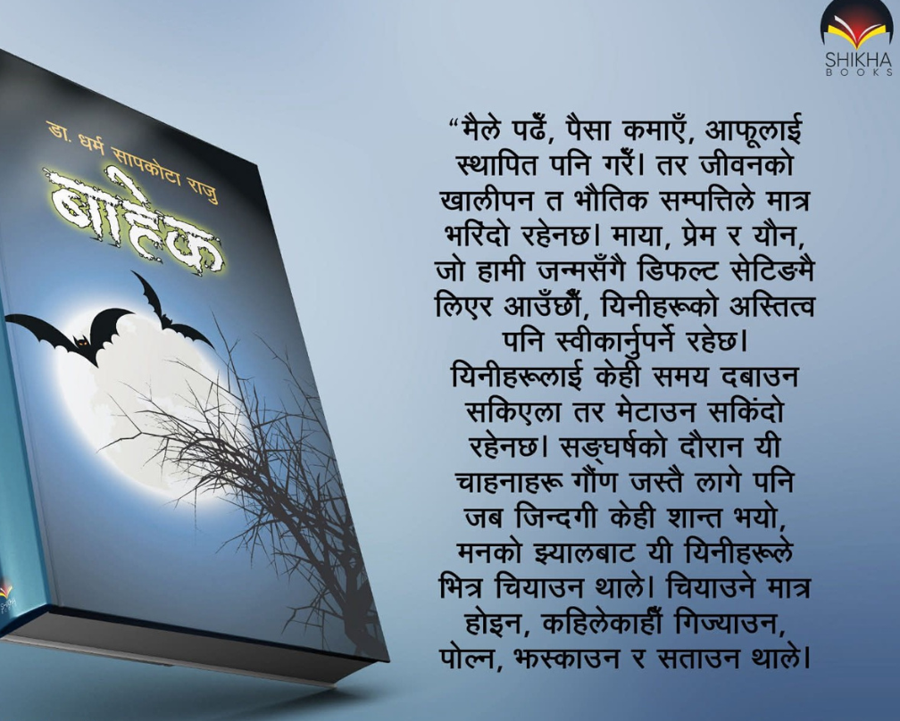 डा. धर्म सापकोटा राजुको पहिलो उपन्यास ‘बाहेक’ सामाजिक र पारिवारिक विषयवस्तुमा आधारित छ । स्कुले जीवनमा नै प्रेममा परेको युवक दिनानाथ एकतर्फी प्रेममा धोका पाएपछि उच्च शिक्षाका लागि काठमाडौँ जान पाउने बहानामा प्रथम डिभिजन छुन भ्याउँछ । गाउँ छोडेपछि काठमाडौंमा चल्ने हावाको स्पर्शसँगै दीनानाथ ‘दर्पण’ मा परिवर्तन हुन्छ । सापकोटाका यसअघि ‘बुद्धिमानीको परीक्षा’ बालकथा संग्रह, ‘बहिर्गमन’ लघुकथा संग्रह र ‘बाटो’ कथा संग्रह प्रकाशित छन्। ‘बहिर्गमन’— available in our store.