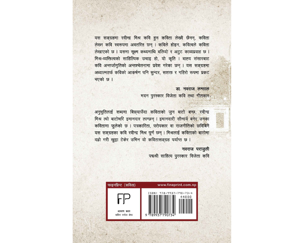 पचास दिन हिरासतमा बस्दा मिश्रले ३५ ओटा कविता लेखेका थिए । तिनै कवितालाई उनले यस संग्रहमा संगृहीत गरेका हुन् । ‘कविताको सोच दिमागमा आउनु सामान्य हो तर त्यो सोच कविताको स्वरूपमा अभिव्यक्त हुनु असामान्य हो । हिरासत बसाइमा मलाई निरन्तर रूपमा कविताका सोचहरू दिमागमा फुरेछन् र तिनलाई मैले कवितामा रूपान्तरण गर्न सकेछु,’ कविताबारे उनले भने । मिश्रको यो दोस्रो कविता संग्रह हो । उनको पहिलो कविता संग्रह ‘रवीन्द्र मिश्रका कविता’ २०७१ सालमा प्रकाशन भएको थियो ।